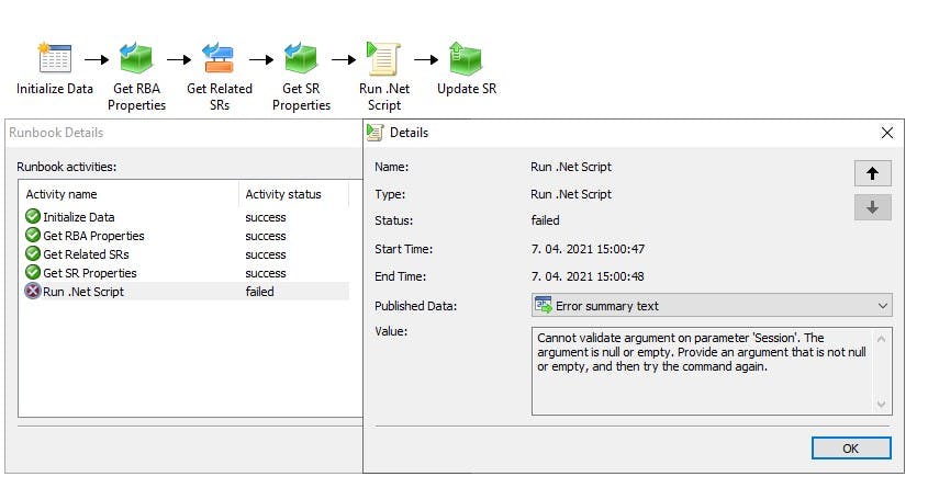 Im trying to run just a basic runbook which grabs the string from the SR and do some magic in PS. When i run the script in ISE (with scorch account) it runs great, even if i try with step trought i completes, but when it is run auto it failes on .net script